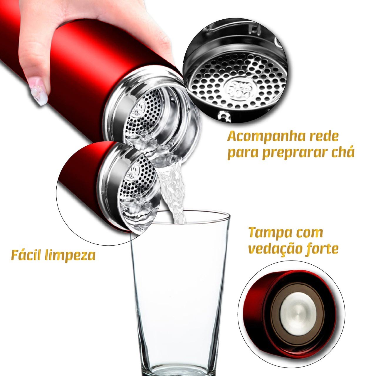 Pode conservar até doze horas a temperatura de sua bebida e além disso acompanha um filtro ideal para você preparar um chá e mantê-lo na temperatura correta.